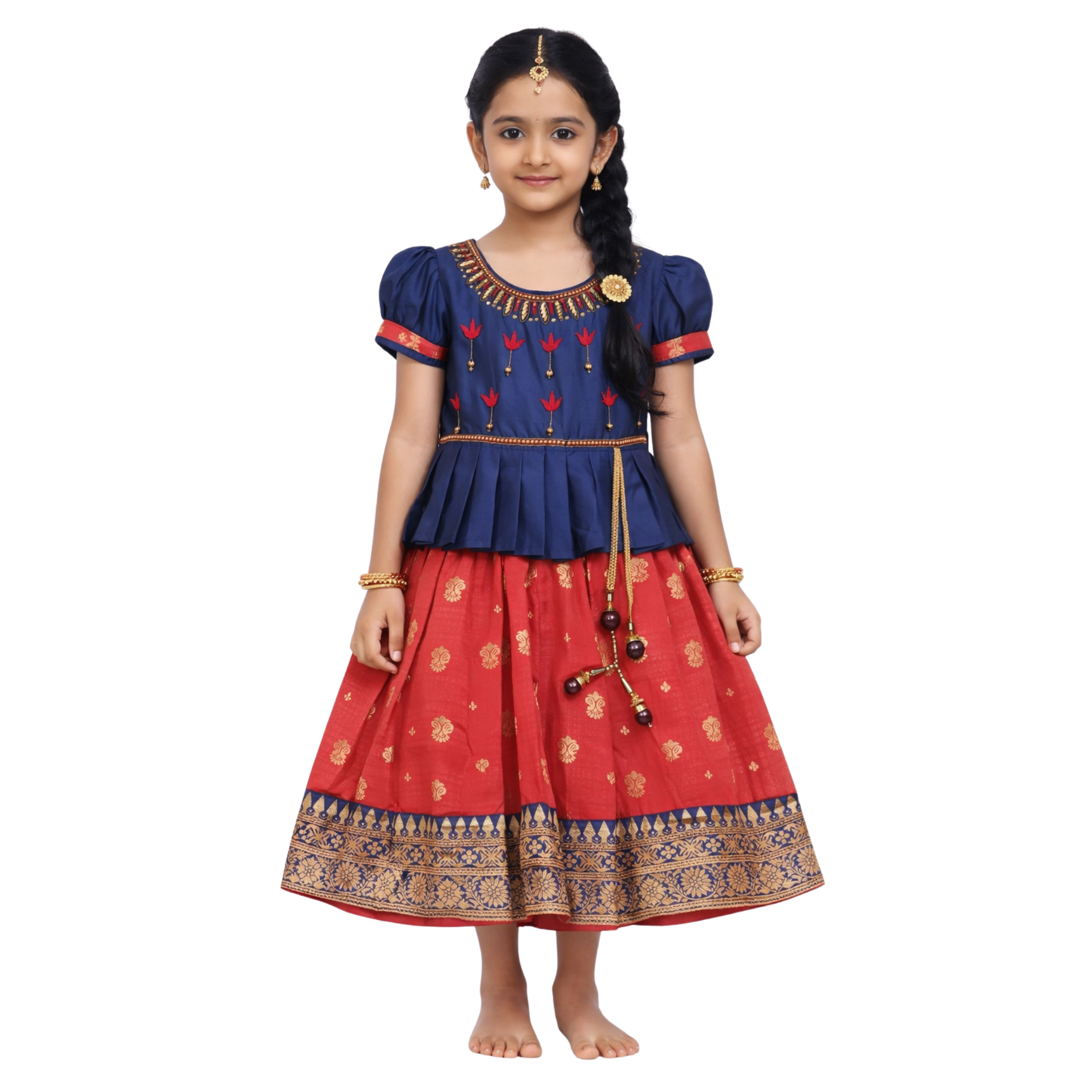 Dress your little one in timeless elegance with this beautifully crafted navy blue and red lehenga choli set. The top features a peplum-style silhouette with delicate embroidery and traditional motifs, adding a modern twist to classic ethnic wear. The short puff sleeves and detailed neckline enhance its charming appeal.